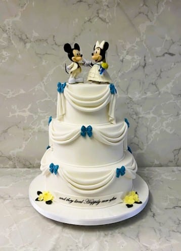 Disney Mickey & Mini wedding cake with sugar swags and Blue bows Cake Topper included 6-8-10" cakes start at €690 Amazing Cakes copy right 2026