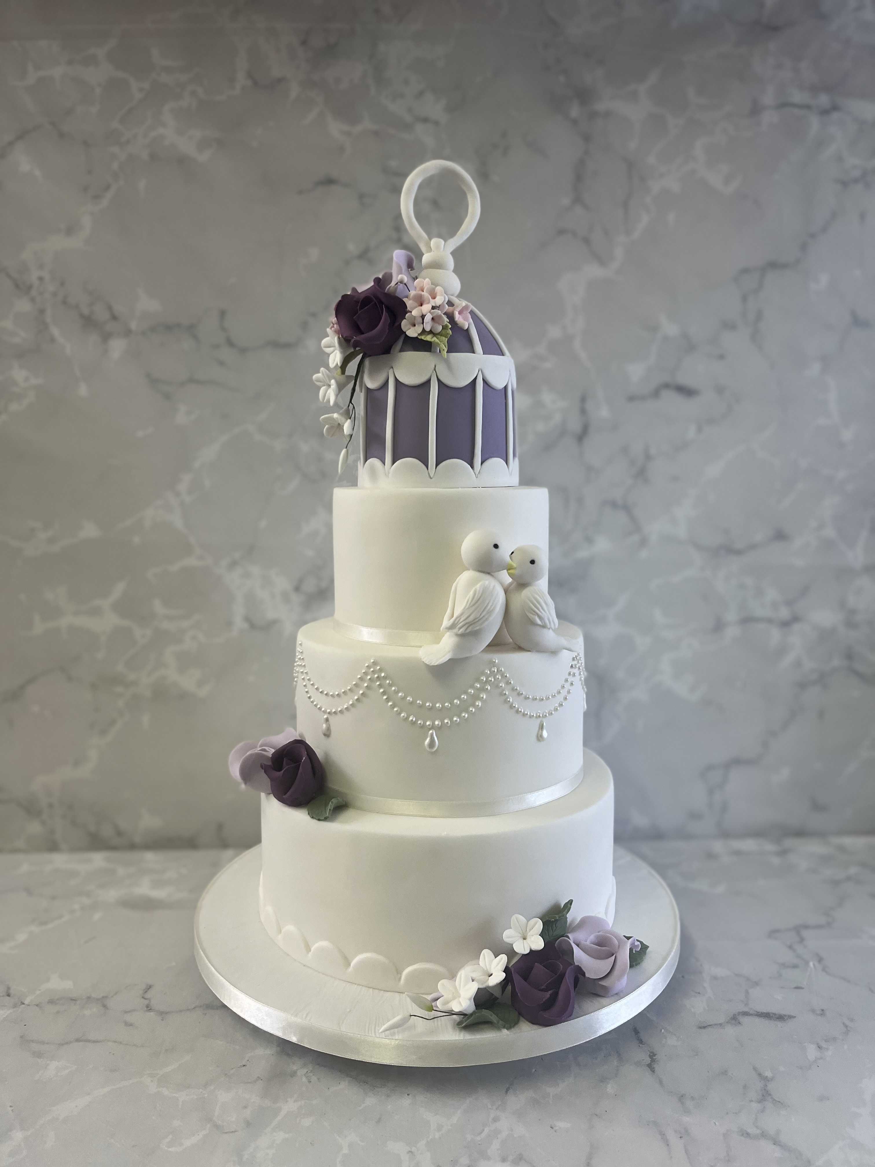 Tracy's Birdcage wedding cake lilac and white with sugar birds and flowers 4-6-8-10" cakes start at €750