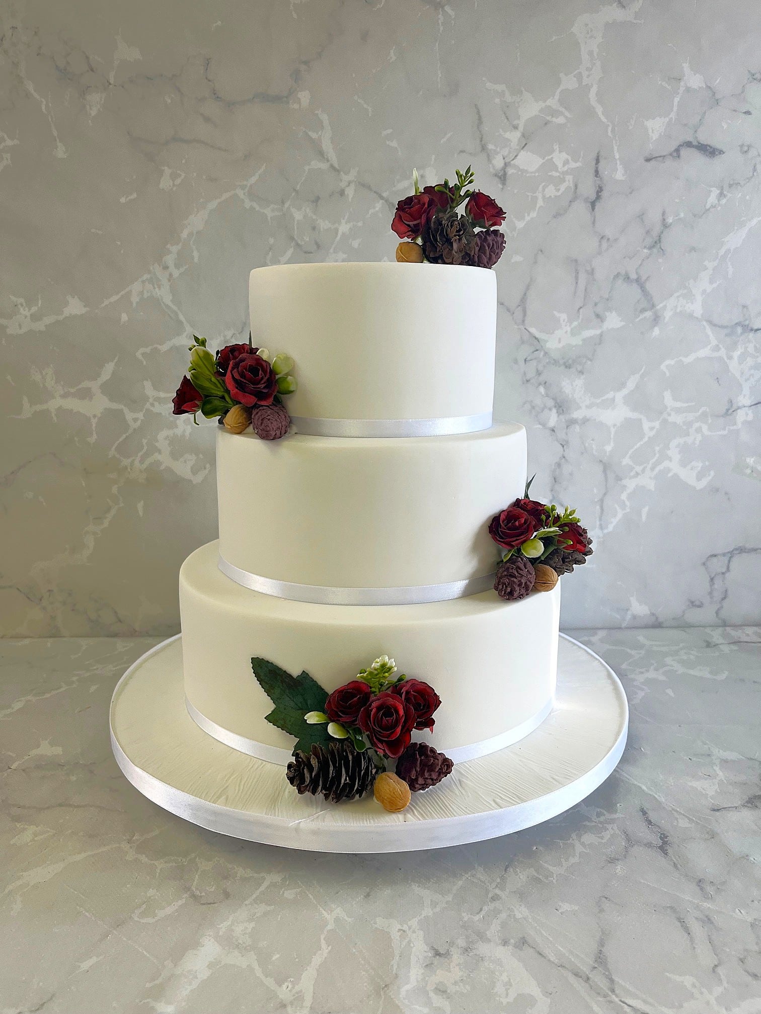 Winter style wedding cake with Silk Christmas style flowers in red and green , with acorns 6-8-10" cakes start at €560