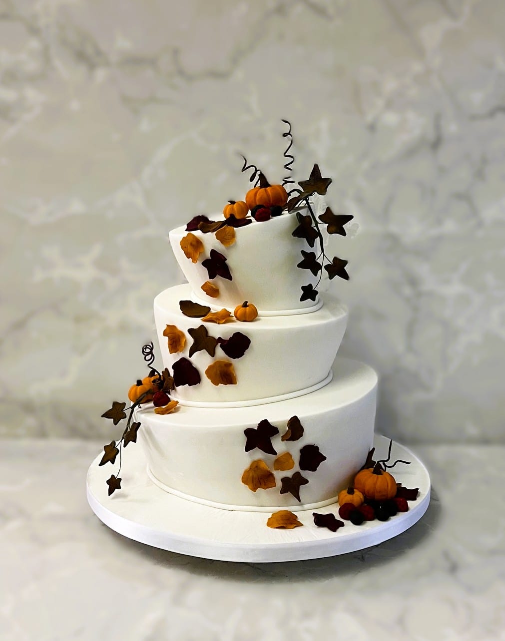 Topsy Turvy Autumn wedding cake with delicate leaf's 6-8-10" cakes start at €690