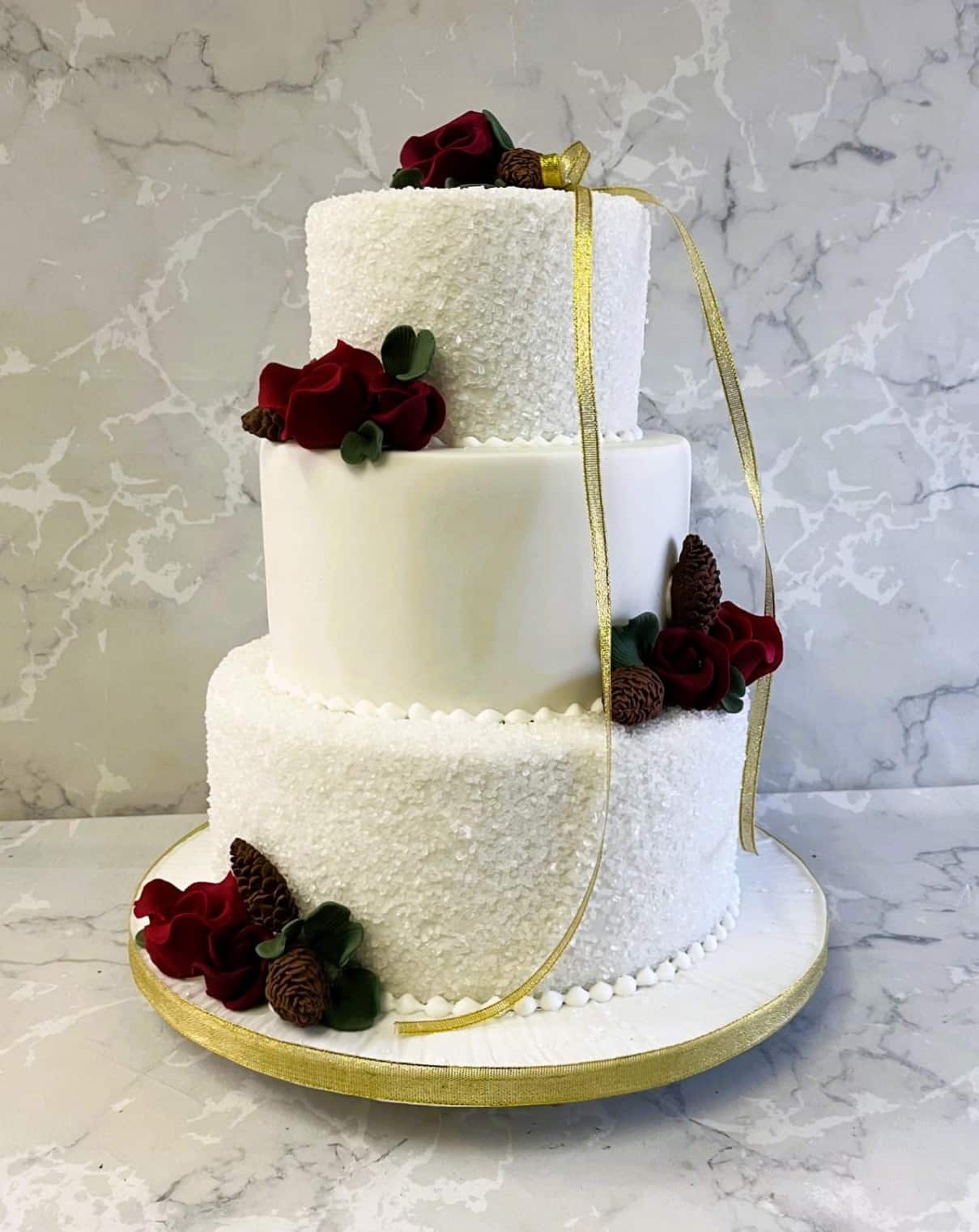 white sugar crystal wedding cake with sugar flowers and gold bow wedding cake 6-8-10" starts at €680